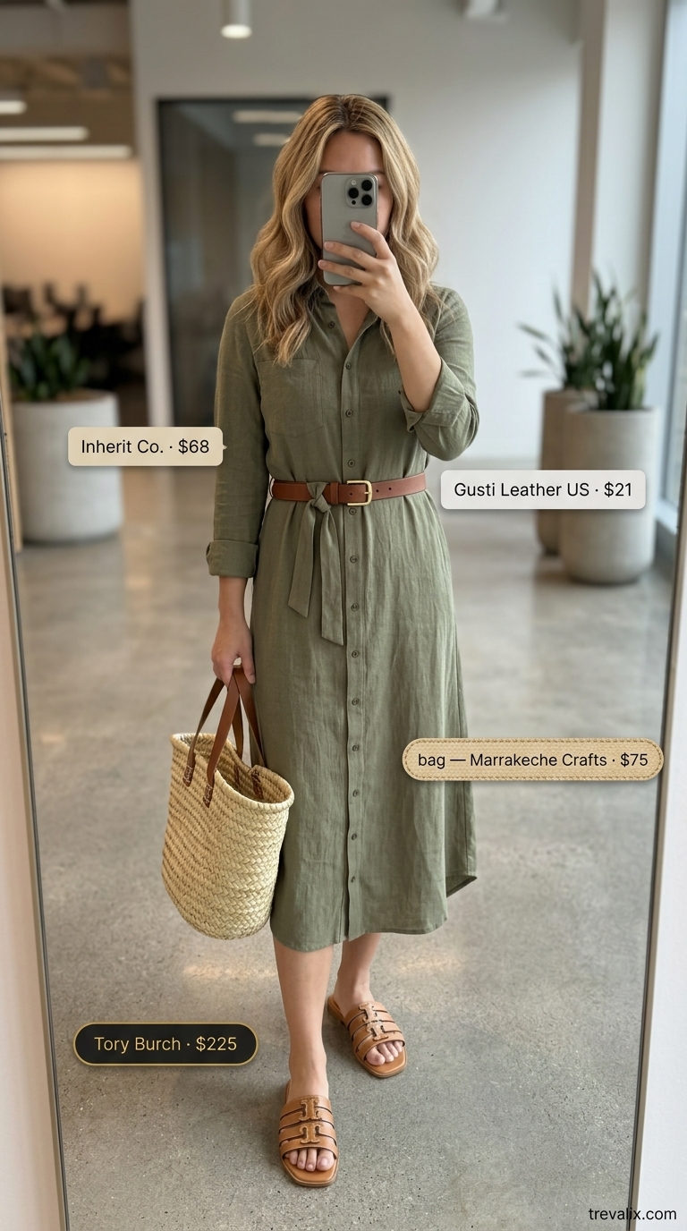 Linen shirt dress in olive green at $68 reads both casual and intentional — perfect for brainstorming days where you’re thinking rather than performing. The tie belt defines your waist without constricting, and breathable linen naturally softens with wear. Genuine leather Tory Burch flat sandals at $225 feel like an investment, but leather stretches minimally and molds to your foot over time, unlike synthetic alternatives. Handwoven straw tote adds texture without looking beachy; it’s substantial enough for papers and laptop. Thick leather belt at $20.95 allows custom hole-punching for a perfect fit.