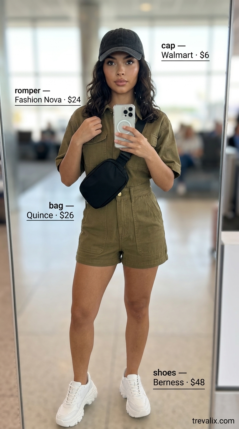 $23.98 cotton-twill utility jumpsuit in khaki-green—short-cropped, four functioning pockets, structured enough to hold its shape after washing. The photo shows the romper styled with a black nylon belt bag ($26) and dark baseball cap ($6.48), plus white platform sneakers. Cotton twill is durable, holds creases where you want them, and doesn’t cling in humid airports. The three functional pockets mean you can skip a full bag if you’re doing a quick airport run. One honest flaw: short rompers expose your legs, so if the flight is cold, that’s a misfire—no easy way to layer without looking cramped.