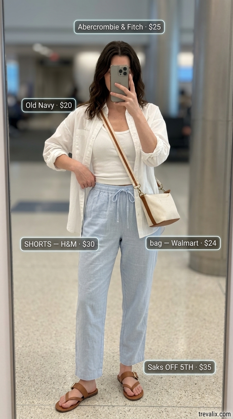 $29.99 linen-blend shorts in sky blue struck that rare balance where comfort and style don’t compete — elastic waist and natural breathability kept legs cool and aired out fast after humid airport walks. Pair with a crisp white oversized button-down shirt ($19.99, cotton poplin) worn open or partially tucked, then slip on tan leather flat sandals ($34.99) that come off instantly at security. This palette whispers calm rather than shouting it, which matters because understated outfits photograph better and feel less costume-like in real life. Not for anyone seeking structure or formality.