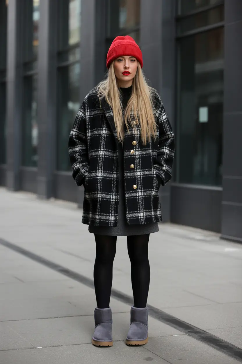 This final glance is a match of a light plaid coat and wide-leg trousers, crisp white tee, sneakers and a small Louis Vuitton handbag. It is simple, friendly, and just the type of fall winter wear that can be used to run errands or go to school.