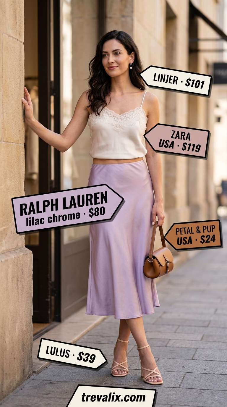 Soft lilac satin skirt with ivory lace camisole and nude beige heels — this is pure romance without the artifice. The color palette hovers in pastels and cream, landing somewhere between garden party and dinner date. What makes it work: each piece whispers rather than shouts, letting the ensemble read as intentional rather than costume-y. Satin drapes without clinging through a seated dinner, which matters because pooling fabric during dessert kills any romantic mood you’ve built. The silhouette stays elegant whether you’re standing or sitting.