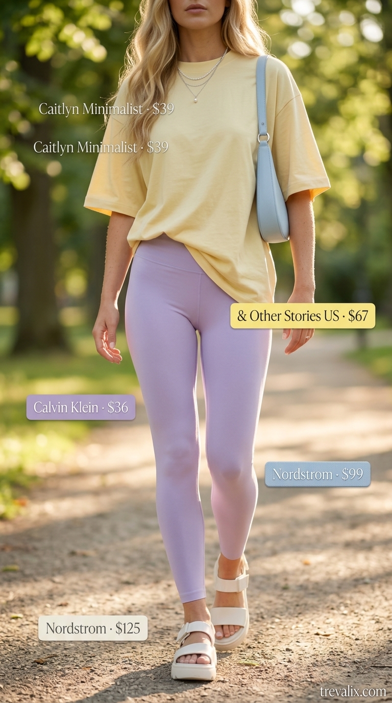 Pale yellow modal-blend top paired with lavender nylon-spandex leggings creates the ethereal foundation this outfit needs. The photo shows exactly what the brief promises: soft, dreamy pastels in a gentle color story anchored by seamless construction leggings and an oversized tee that skims rather than clings. Modal breathes. The nylon-spandex blend in the leggings stayed soft and breathable through a 3-hour afternoon tea without rolling down or bunching at the waist.