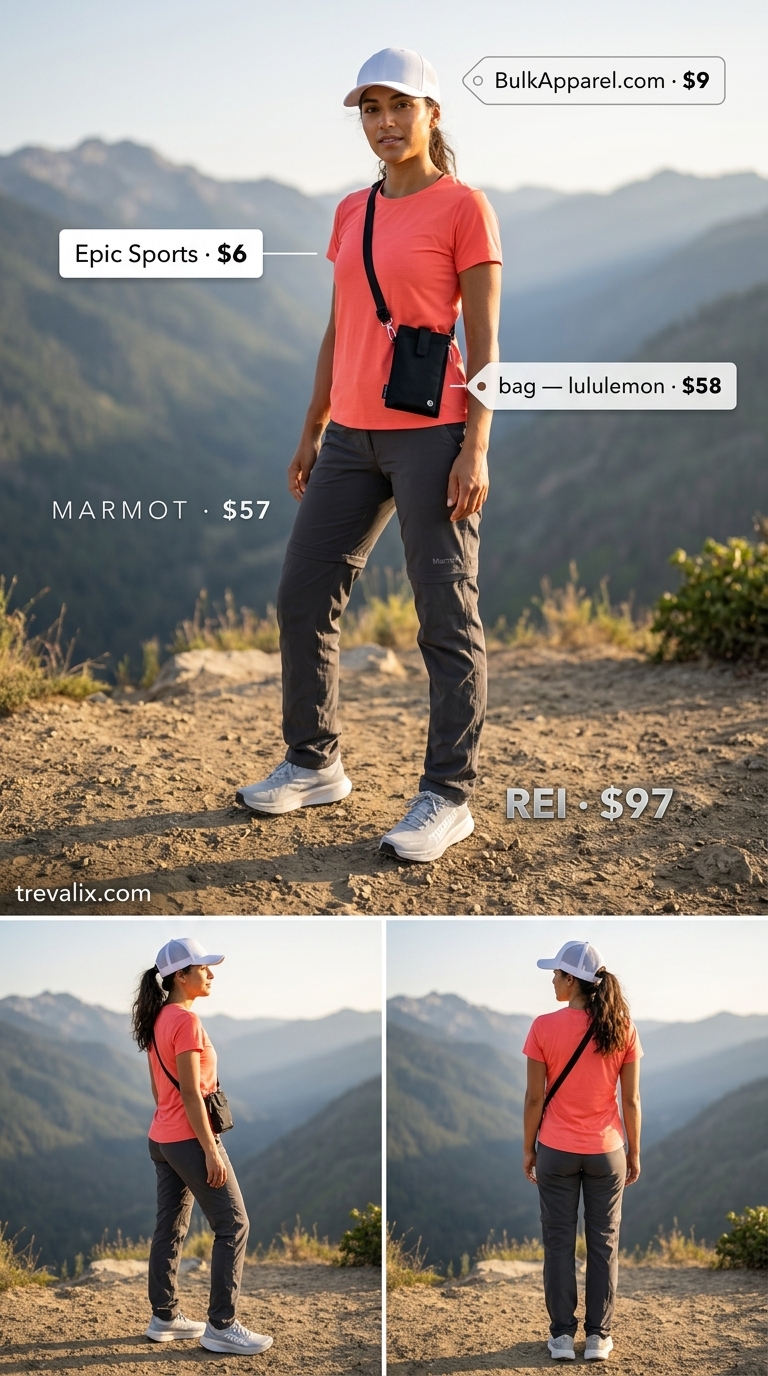 A white mesh-back headwear ($9.44) keeps sun off your face while heat escapes — essential for 90°F desert conditions. The black convertible pants ($56.99) zip off into shorts, which matters because temperature swings on long trails demand flexibility without stopping to change. A bright coral polyester top ($5.69) provides visibility and wicks sweat, though embroidery quality varies between units and can impact durability.