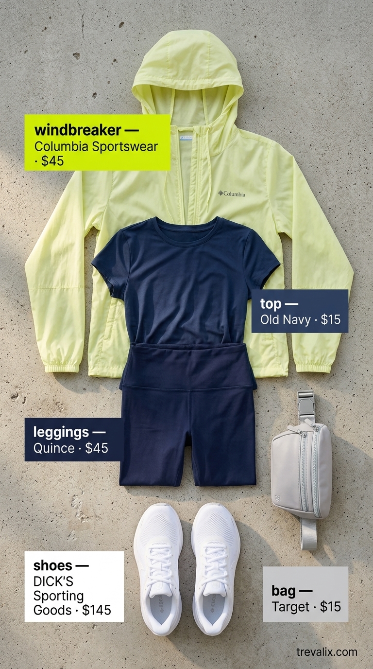 Pale yellow ripstop nylon windbreaker at $45 layers over navy polyester base layer — not reversible, so commit to this color story. The rule here is tight layering: mesh base pulls sweat away from skin, then the packable shell traps warmth without bulk. Nylon-spandex leggings tuck into trail shoes for clean lines and unrestricted movement during dynamic scrambles where loose fabric catches on brush. This stacking method keeps your core stable whether you’re ascending or traversing exposed ridges.