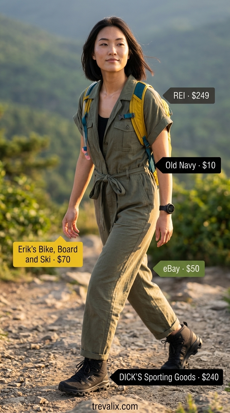 During a 3-hour moderate hike across varied terrain, the jumpsuit delivered ample freedom of movement and held its shape without sagging at the crotch or knees. Real downside: if you need a bathroom break mid-trail, you must remove the entire top half — a serious logistical issue for longer expeditions or IBS hikers. Pair with black waterproof hiking shoes ($239.99) for stability on technical footing, then add a mustard-yellow hydration pack ($70) across the chest for a pop of color and water access. The pack breaks up the monochrome vibe while keeping hands free. Total outfit: $369.99, excluding shoes. Finally, pockets that fit.