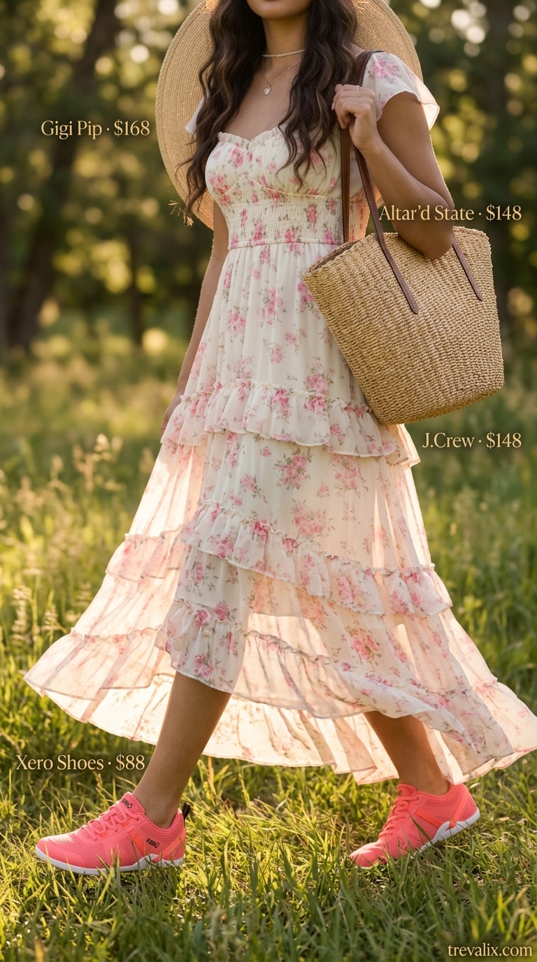 $148 floral maxi dress in pastel print + $148 straw tote + wide-brim straw hat ($168) + zero-drop platform shoes ($87.99) create romantic boho energy without feeling costume-adjacent. Viscose or lightweight cotton breathes during leisurely summer movement — the zero-drop sole from the shoes promotes natural foot posture during picnic strolls. Tiered silhouette and flowing length give feminine softness; natural straw accessories ground the palette in tan and cream rather than pure white. Gold layering necklaces enhance the romantic Y2K feel. Total $551.99 outlay is steep, but straw hats last multiple seasons if stored flat indoors. Hand-wash viscose in cool water to avoid dye bleeding.