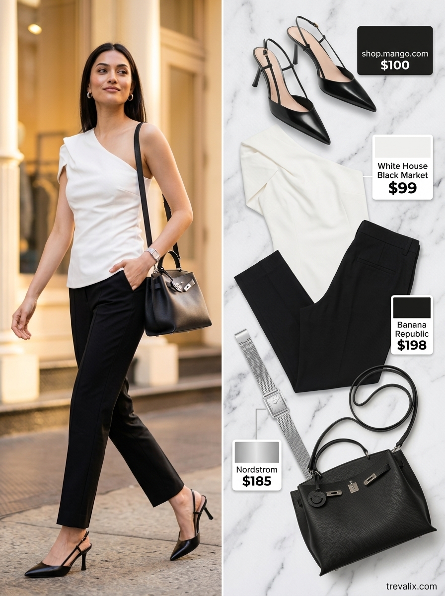 White House Black Market poplin top at $99 delivers structured fabric that refuses to shift during a full workday — the one-shoulder silhouette holds its form because poplin cotton-blend resists slouching. The photo shows a crisp white against deep black tailored trousers, creating visual contrast that photographs sharply and reads as intentional even in fluorescent office lighting. Banana Republic wool-blend pants at $198 feel substantial underfoot, and the slim fit balances the volume any one-shoulder top naturally creates at the neckline. Grained leather satchel at $112.99 completes the narrative with silver hardware that echoes accessories without competing for attention.