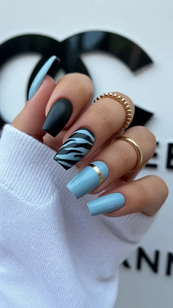 For the polishes, I recommend OPI’s _Check Out the Old Geysirs_ for that perfect ice blue, then top it with DND Gel’s matte black. Use fine metallic striping tape for delicate edges and a zebra-print stamping plate for the show-stopping detail. Elle Magazine already named this combo the one noshort nails can live without in 2025.