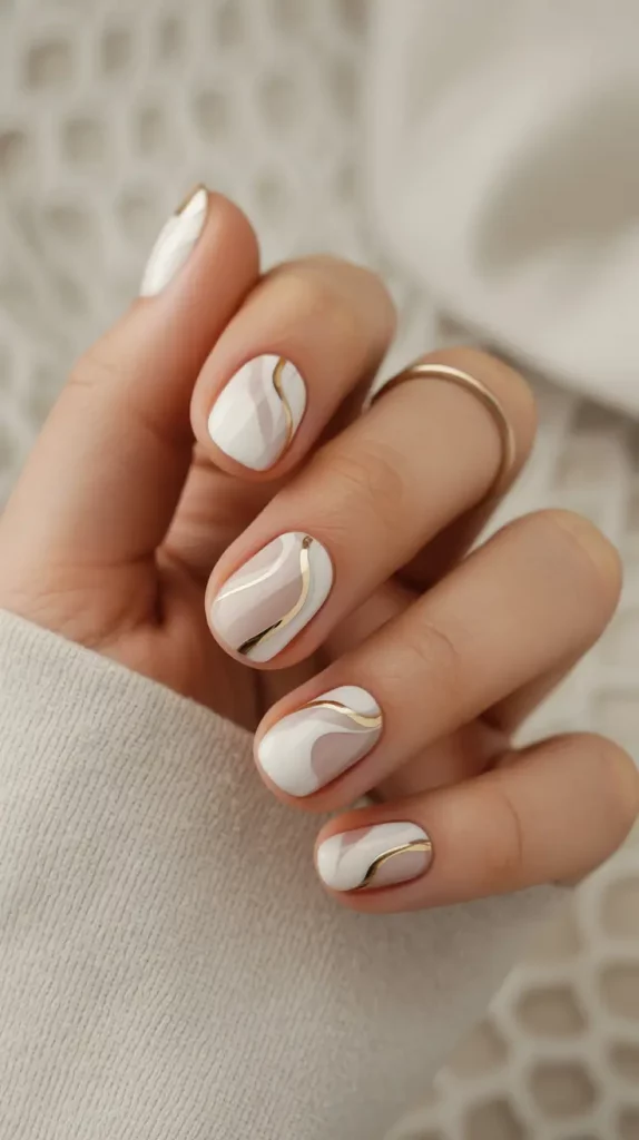 Milky white swirls kissed with blush and tinged gold create an effect like satin marble that quietly glows. On short nails, it really sparkles and drives home the idea that you don’t need long tips to feel luxurious. This is the go-to fall-winter color for 2025, blending artistry with serious wear-anywhere-vibes.