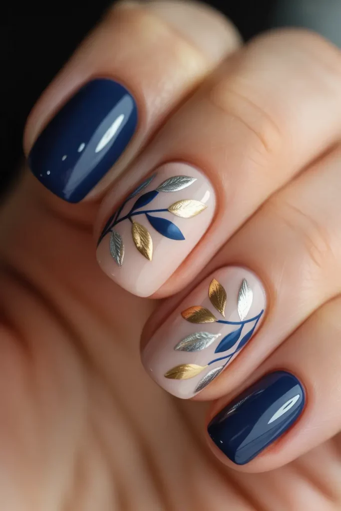 Navy polish with shimmering gold and silver leaves looks jaw-dropping yet stays classy. The navy tames the overall vibe, and the metallic leaves lift it straight into the future. It’s daring, but it doesn’t yell—ideal for 2025’s shorter gel manicures that play nice with any outfit.