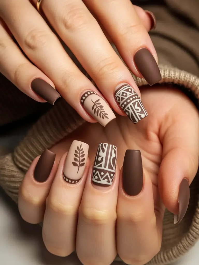 Rich chocolate browns combined with crisp lines and organic designs create a cozy, artful vibe for fall. The matte finish makes it even cozier and strikes a perfect balance for 2025 nail art fans thirsty for something other than the same-old nudes.