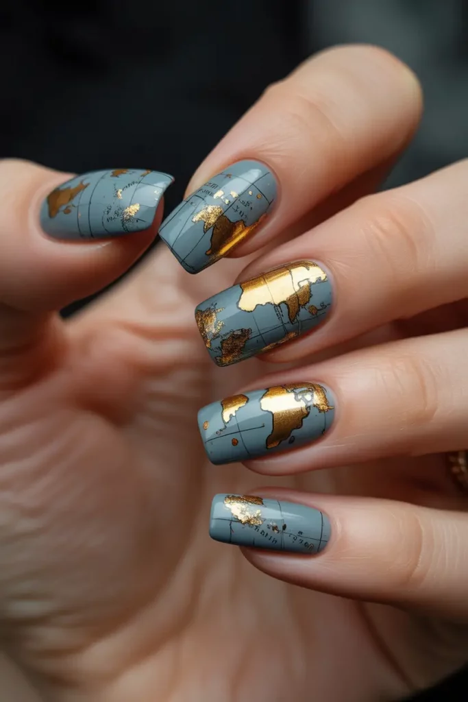 Start with Opi’s Less is Norse, a murky gray geode. Layer soft gold foil to trace continents, or use Dnd’s muted gray gel with tiny gold accents for continents so polished they look like tiny maps.