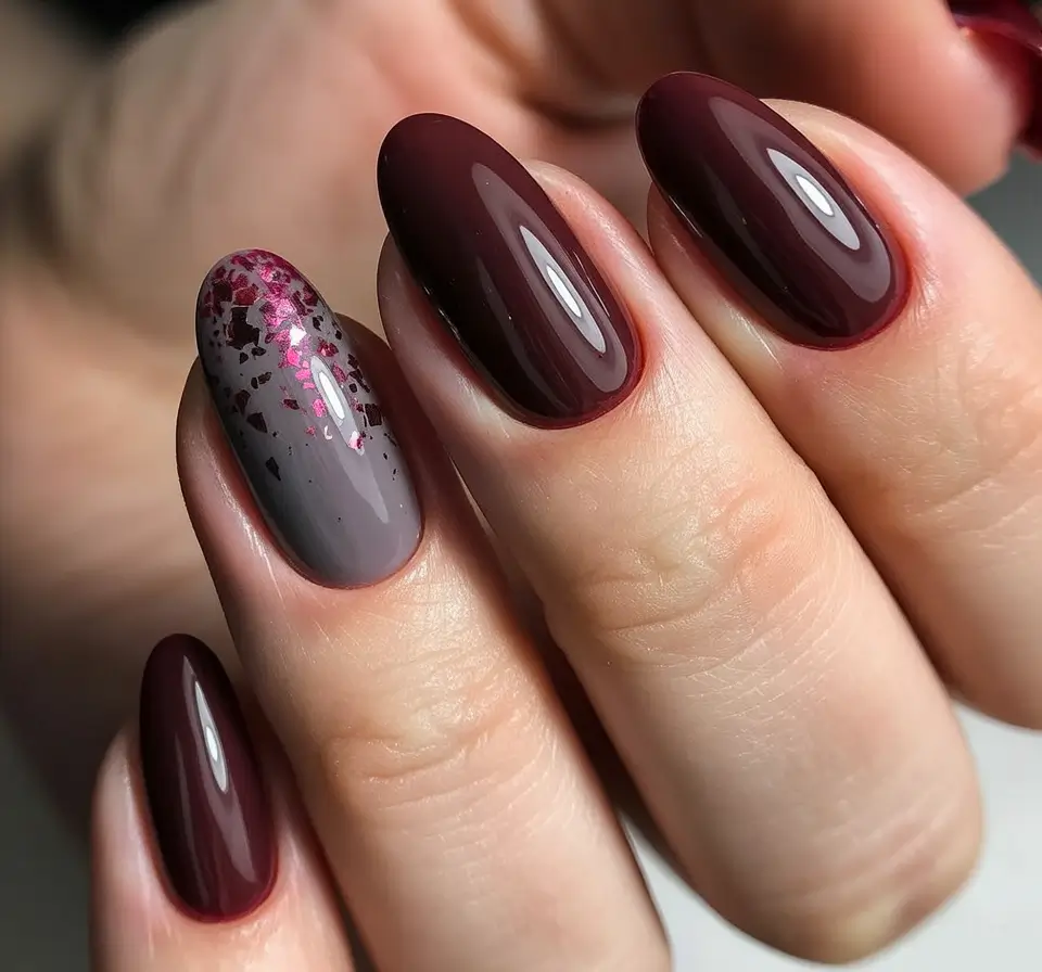A deep, juicy berry fading to smoky gray, dotted with soft pink sparkles, gives off that mix of mystery and warmth that winter nails crave. This is the 2025 fall/winter color everyone’s going to want the moment the temperature drops because it’s dramatic enough to show off next to glowing fireplace light, yet still wraps the nails in cozy glam.